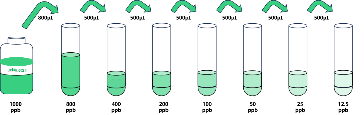 試劑盒中取出標(biāo)準(zhǔn)品,準(zhǔn)備7個試管,先將1000ppb標(biāo)準(zhǔn)品(1mL)按需吸取一定量用1×稀釋液稀釋至800ppb(例:800µL的標(biāo)準(zhǔn)品母液+200µL的1×稀釋液,制備得到1000μL的800ppb濃度標(biāo)準(zhǔn)品),隨后在6個試管中分別加入500μL的1×稀釋液,在這6個單獨(dú)的試管中將800ppb標(biāo)準(zhǔn)品依次2倍倍比稀釋至7個梯度,共配制7個濃度的標(biāo)準(zhǔn)品,依次為:800ppb、400ppb、200ppb、100ppb、50ppb、25ppb、12.5ppb,從最高濃度標(biāo)準(zhǔn)品溶液中吸取500μL標(biāo)準(zhǔn)品到下一個試管中,輕輕吹打混勻,以此類推進(jìn)行標(biāo)準(zhǔn)品的倍比稀釋(如圖所示),1×稀釋液用作零濃度標(biāo)準(zhǔn)品(0ppb)。