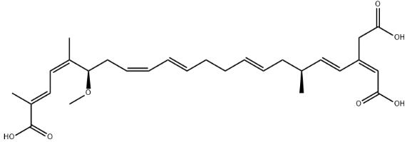 椰毒假單胞菌酵米面亞種產(chǎn)生的一種可以引起食物中毒的毒素。系統(tǒng)命名為:3-羧甲基胺-17-甲氧基-6,18,21-三甲基-廿二碳-2,4,8,12,14,18-七烯二酸。