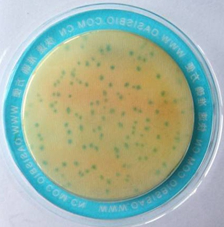 呈藍綠色的菌落為阪崎腸桿菌。出現陽性菌落的樣本,最好用其他更為可靠的方法進行驗證,或者至少再取樣重復檢驗一次。