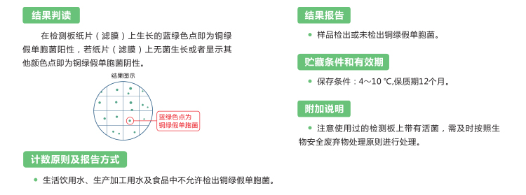 用途:適合于生活飲用水、生產加工用水及食品中銅綠假單胞菌的快速檢測。